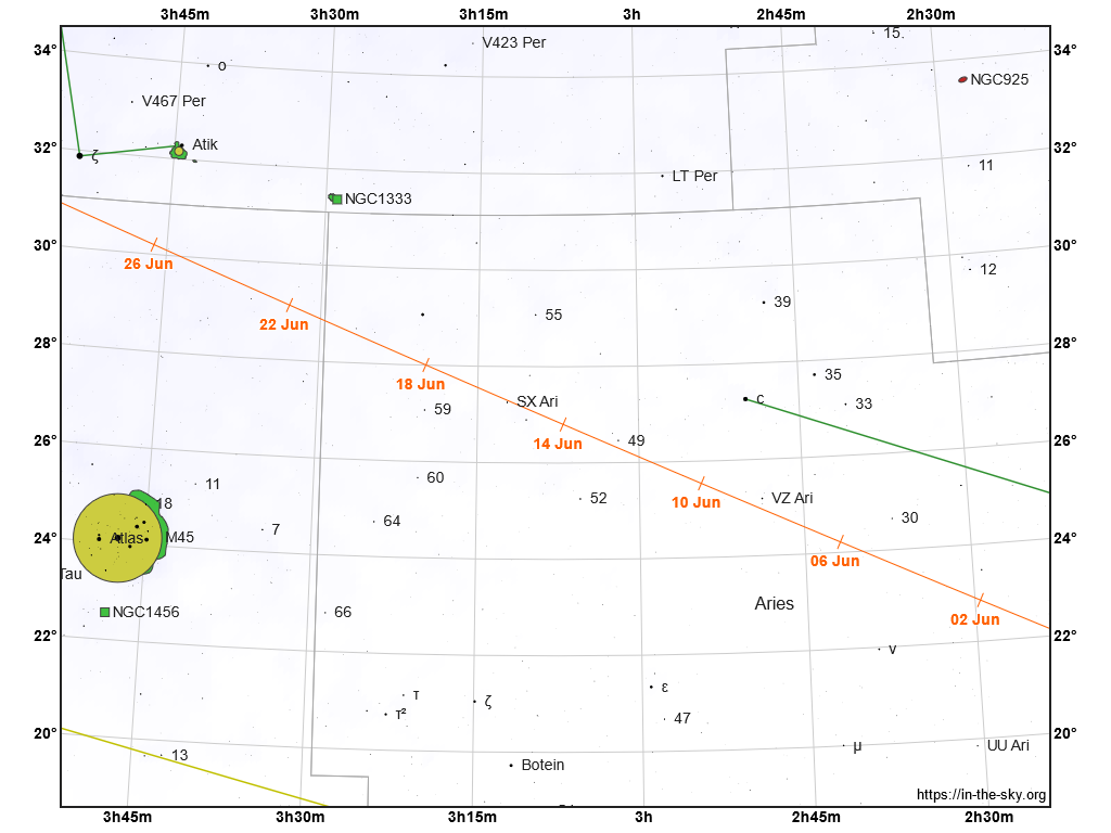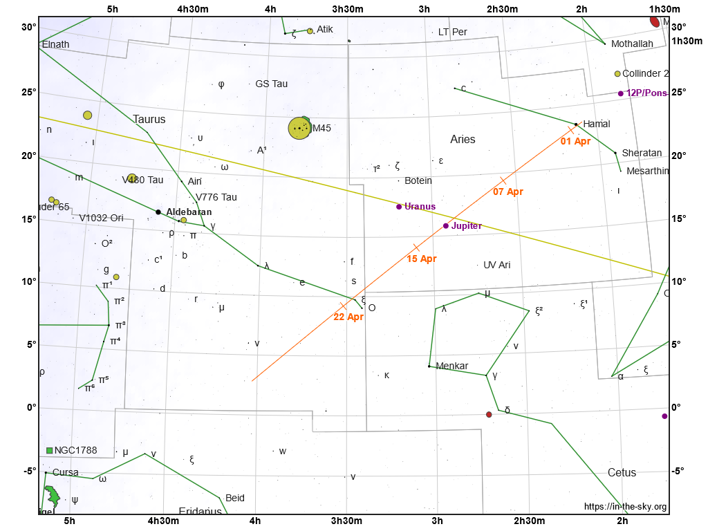 Vyhľadávacia mapka kométy 154 P/Brewington (oranžová čiara s dátumami) v súhvezdiach Barana a Býka. Žltá čiara znázorňuje ekliptiku.