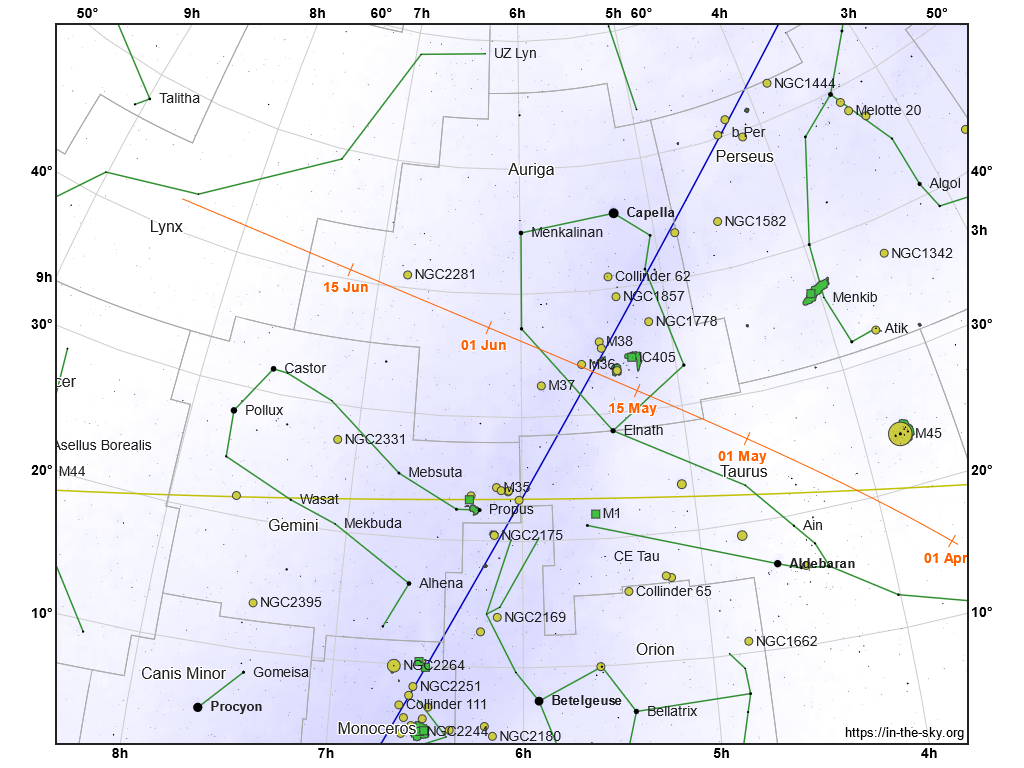 Vyhľadávacia mapka kométy 13P/Olbers (oranžová čiara s dátumami) v súhvezdiach Býk, Povozník a Rys. Žltou čiarou je znázornená ekliptika, modrou galaktický rovník.