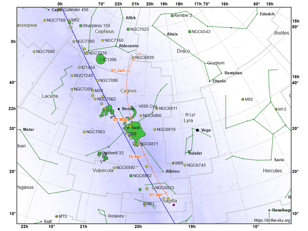 Vyhľadávacia mapka kométy C/2021 S3 (oranžová čiara s dátumami) v súhvezdiach Líštička, Labuť a Cefeus. Modrá čiara znázorňuje galaktický rovník.