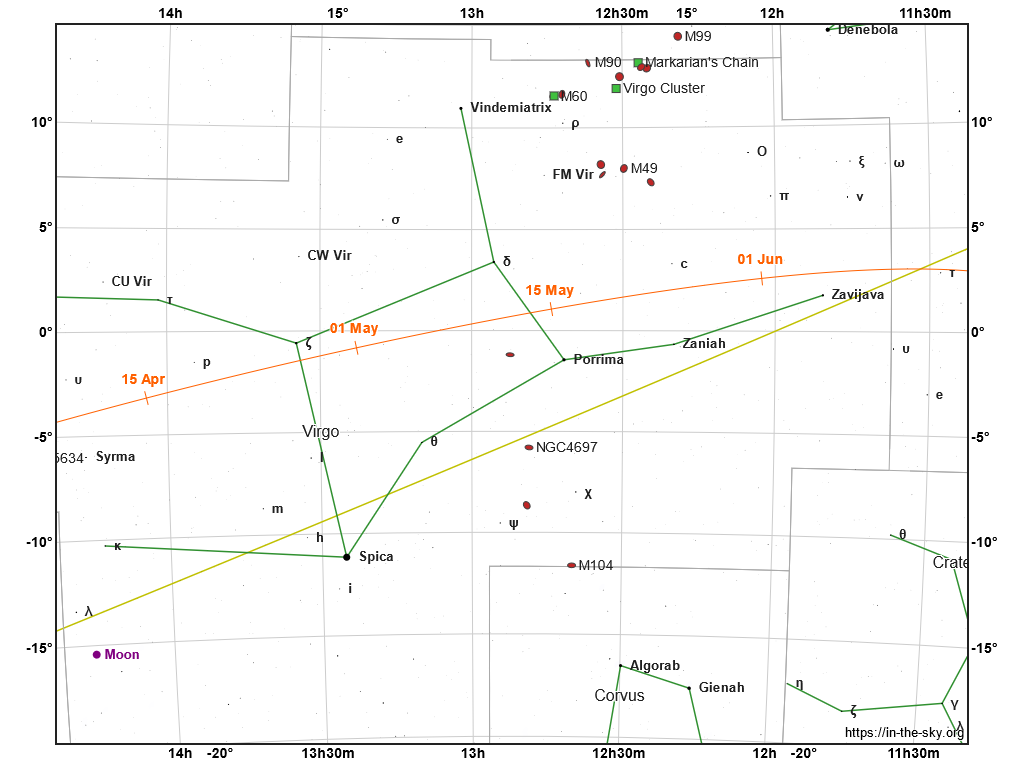 Vyhľadávacia mapka kométy C/2023 A3 (oranžová čiara s dátumami) v súhvezdiach Panna a Lev. Žltá čiara znázorňuje ekliptiku.