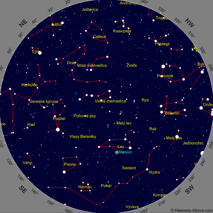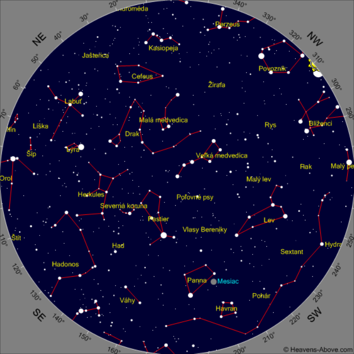 Máj – večerná obloha (poloha Mesiaca 16. mája)