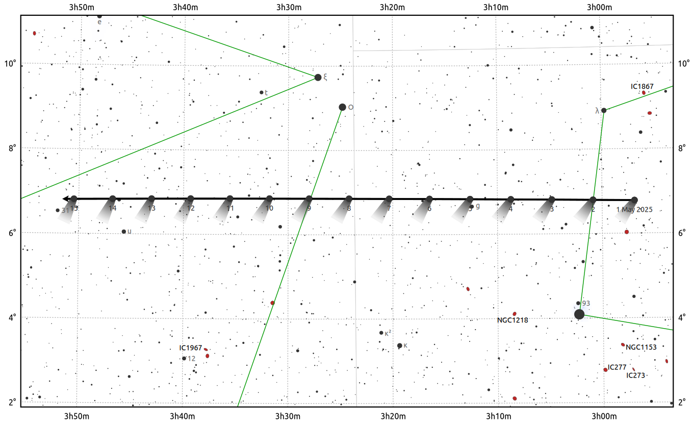 Vyhľadávacia mapka kométy C/2023 A3 v prvej polovici mája 2025 v súhvezdiach Veľryba a Býk. Zelené čiary spájajú hviezdy v obrazcoch súhvezdí.