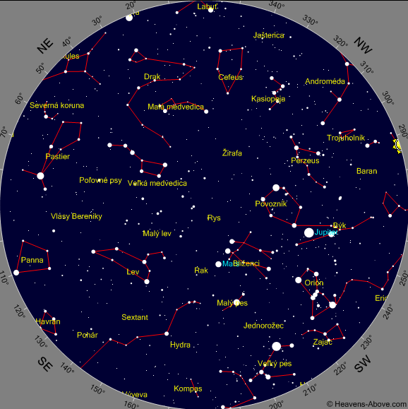 Jupiter – bude až do polovice júna na večernej oblohe, čas na pozorovanie sa skracuje. V apríli zapadá o polnoci, v máji okolo 23. hodiny a v prvej polovici júna 1 hodinu po západe Slnka. V druhej polovici júna sa stratí vo večernom súmraku.