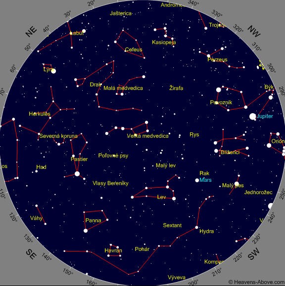Mars – podmienky na pozorovanie sú výborné, celý druhý štvrťrok bude na večernej oblohe. V apríli zapadá 3 hodiny po polnoci, v máji jeden a pol hodiny po polnoci a júni okolo polnoci.