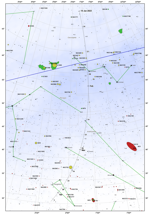 Vyhľadávacia mapka kométy C/2020 V2 (čiara s dátumami) v súhvezdiach Kasiopeja Androméda a Trojuholník. Modrou čiarou je vyznačený galaktický rovník.