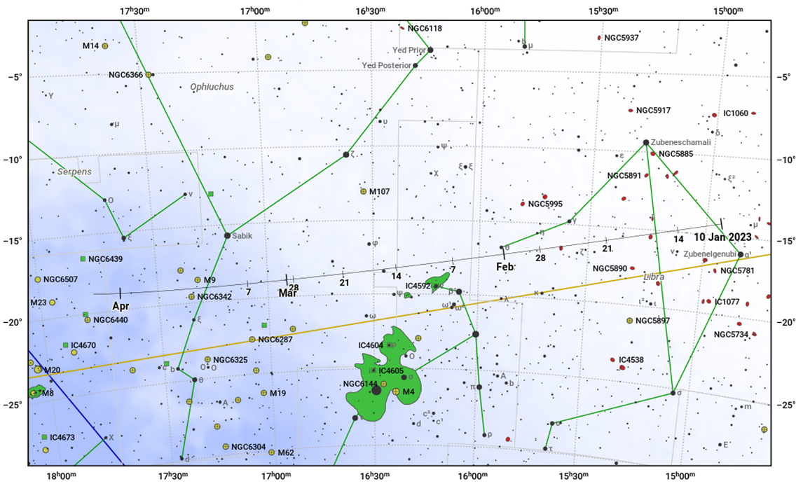 Vyhľadávacia mapka kométy 81P Wild (čiara s dátumami) v súhvezdiach Váhy a Hadonos. Žltou čiarou je vyznačená ekliptika a modrou galaktický rovník.