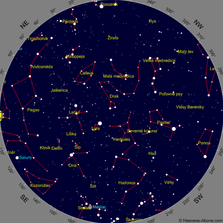 Február – ranná obloha (poloha Mesiaca 14. februára)