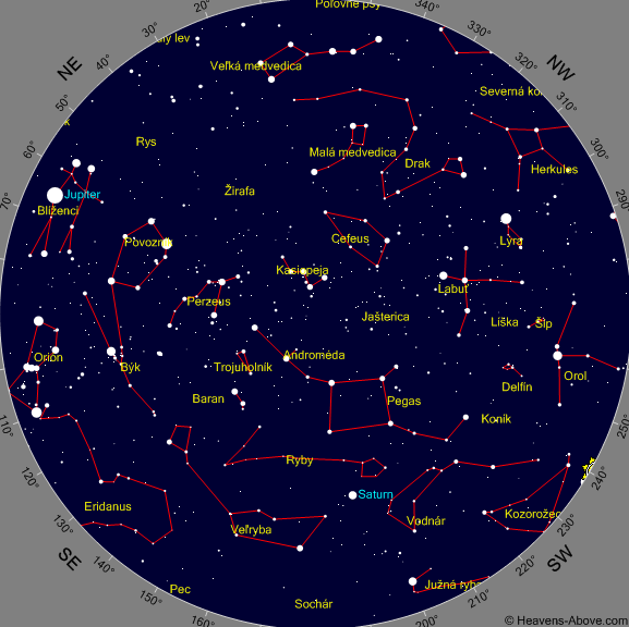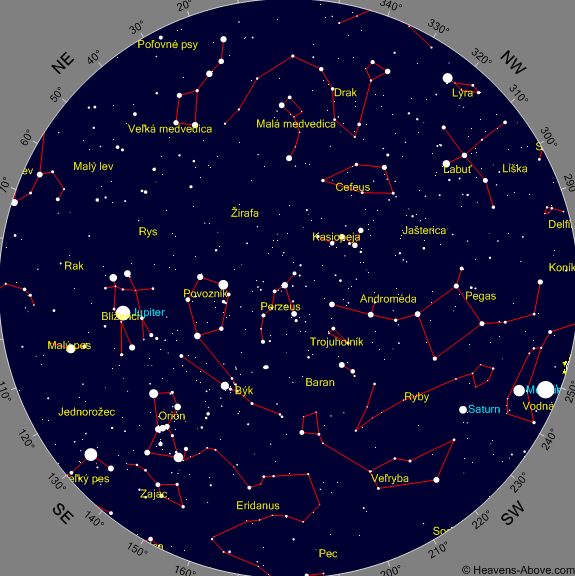 Jupiter – podmienky na pozorovanie Jupitera budú výborné. V januári bude na nočnej oblohe celú noc. Vo februári bude zapadať ráno okolo 5. hodiny, v marci okolo 3. hodiny.