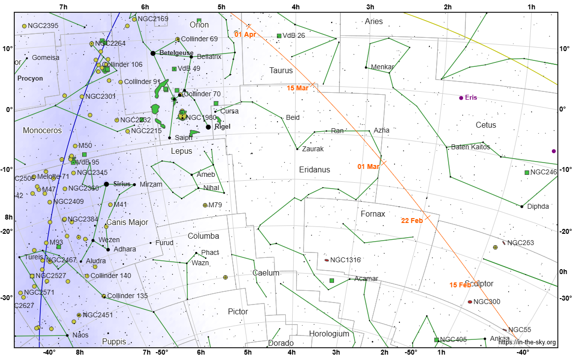 Vyhľadávacia mapka kométy C/2024 E1 (Wierzchos) (oranžová čiara s dátumami) vo februári a marci 2026 v súhvezdiach Sochára, Pece, Veľryby, Eridana a Býka. Zelené čiary spájajú hviezdy v obrazcoch súhvezdí. Modrá čiara znázorňuje galaktický rovník, žltá čiara znázorňuje ekliptiku.