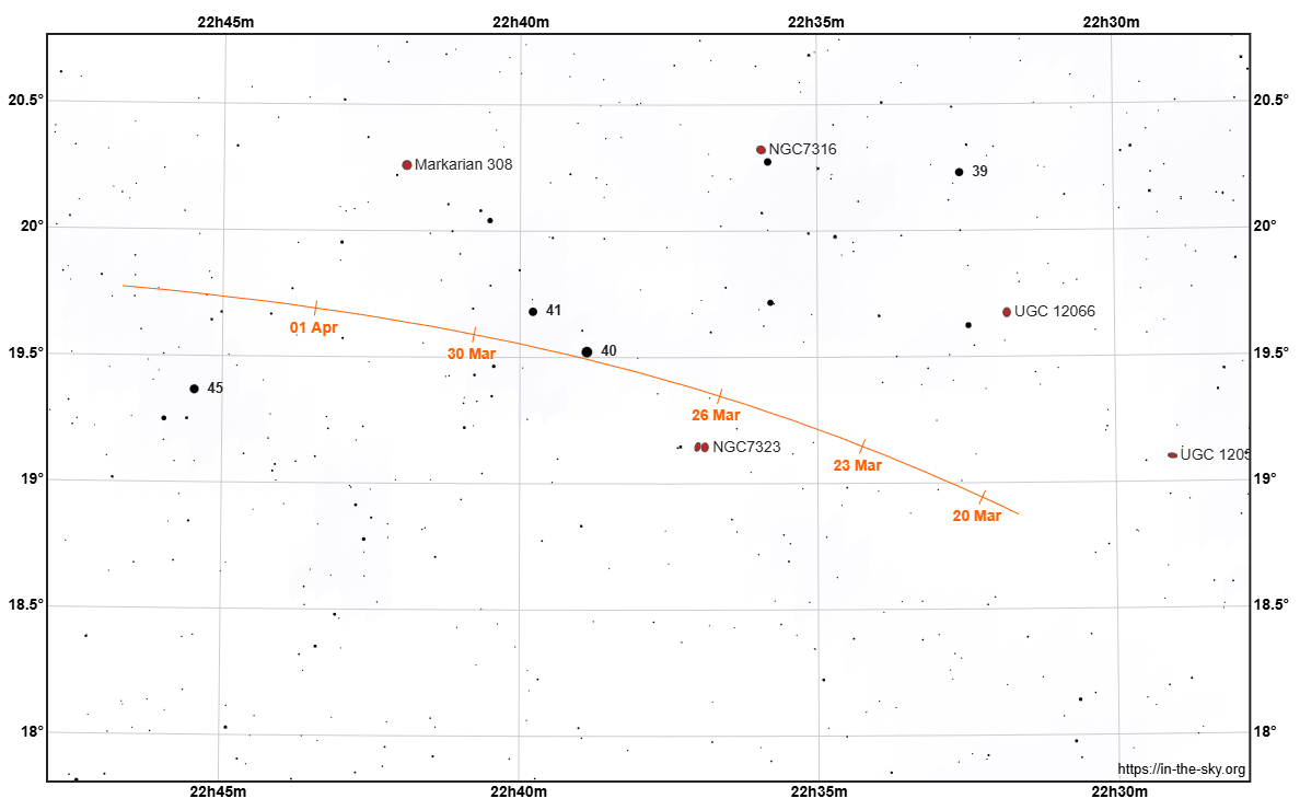 Vyhľadávacia mapka kométy C/2025 R3 (PANSTARRS) (oranžová čiara s dátumami) v poslednej dekáde marca 2026 v súhvezdí Pegasa.