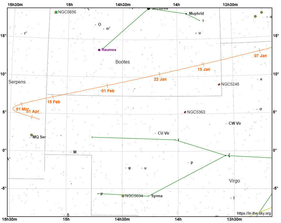 Vyhľadávacia mapka kométy 24P/Schaumasse (oranžová čiara s dátumami) v januári až marci 2026 v súhvezdiach Panny, Pastiera a Hada. Zelené čiary spájajú hviezdy v obrazcoch súhvezdí. Žltá čiara znázorňuje ekliptiku.