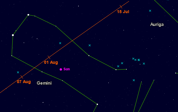 Mars – pozorovateľný v júli na večernej oblohe, pozorovacie podmienky sa postupne zhoršujú s približovaním k Slnku. V auguste a septembri nie je pozorovateľný.