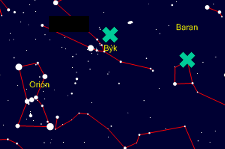Radianty meteorického roja Tauríd. Vľavo radiant severnej vetvy, vpravo radiant južnej vetvy.