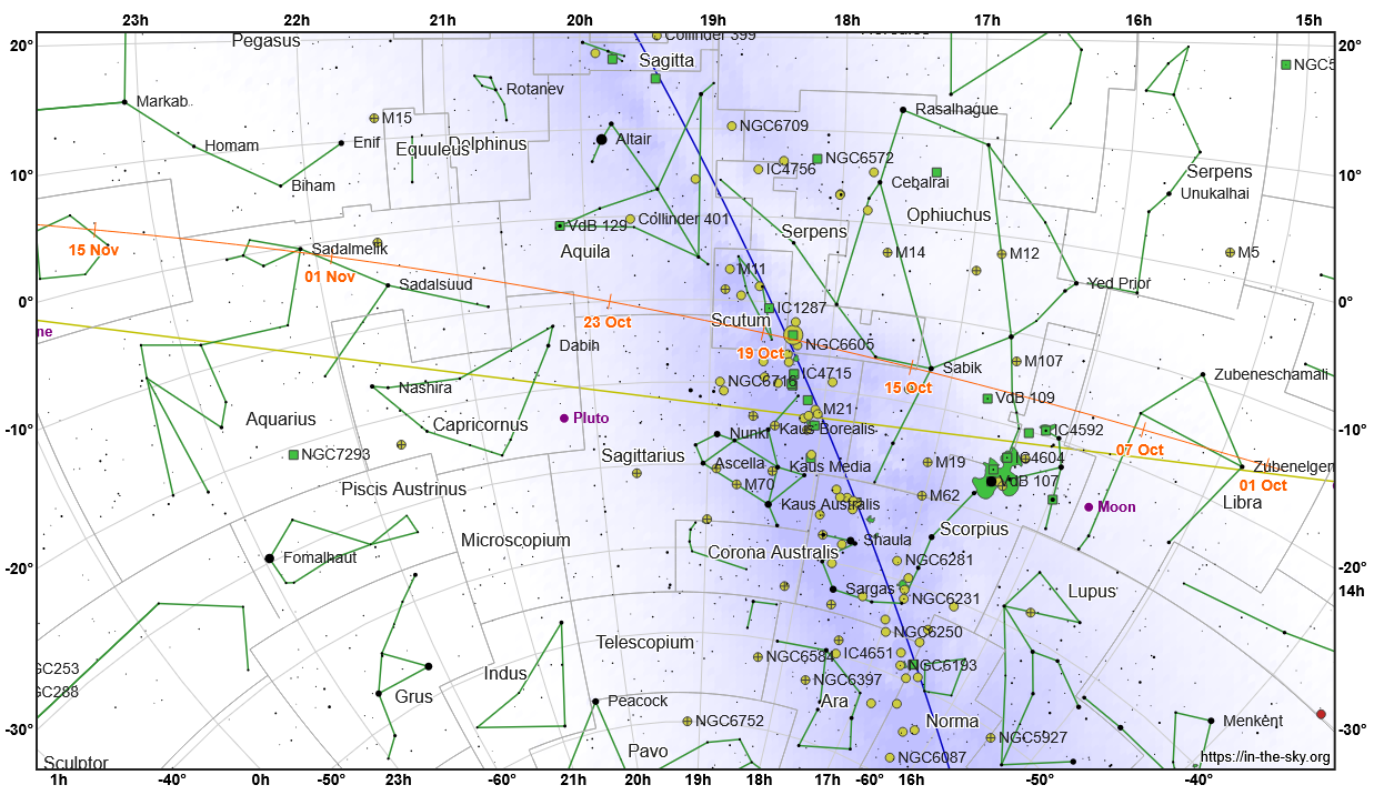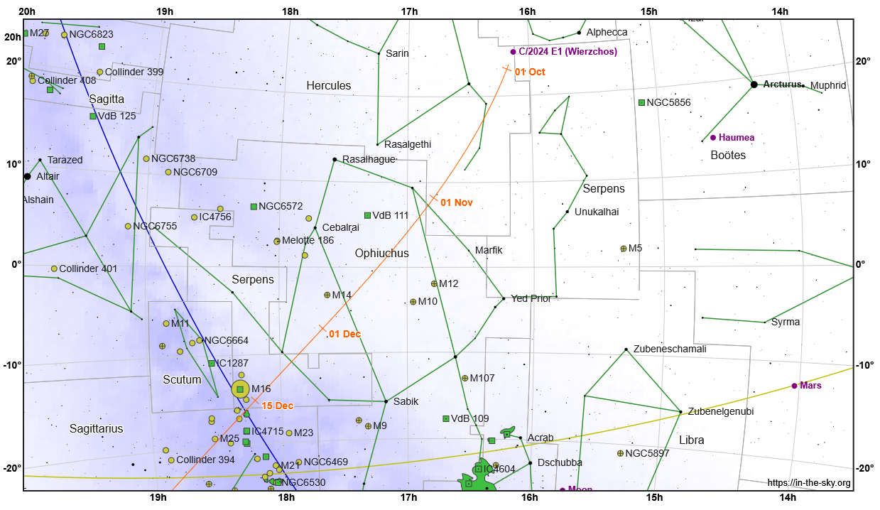 Vyhľadávacia mapka kométy C/2024 E1 (oranžová čiara s dátumami) v októbri, novembri a decembri 2025 v súhvezdiach Herkules, Hadonos, Had a Strelec. Zelené čiary spájajú hviezdy v obrazcoch súhvezdí. Modrá čiara znázorňuje galaktický rovník, žltá čiara ekliptiku.