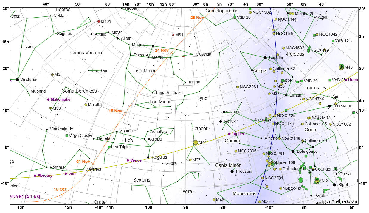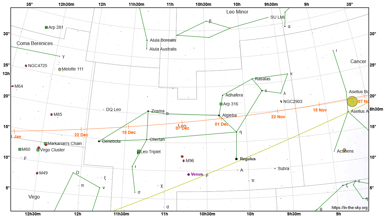 Vyhľadávacia mapka kométy 24P (oranžová čiara s dátumami) v novembri a decembri 2025 v súhvezdiach Rak, Lev a Vasy Bereniky. Zelené čiary spájajú hviezdy v obrazcoch súhvezdí. Žltá čiara znázorňuje ekliptiku.