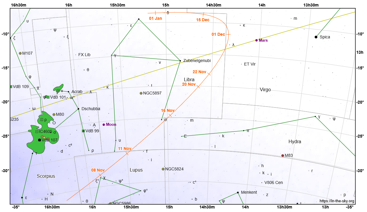 Vyhľadávacia mapka kométy 210P (oranžová čiara s dátumami) v novembri a decembri 2025 v súhvezdiach Škorpión, Vlk a Váhy. Zelené čiary spájajú hviezdy v obrazcoch súhvezdí. Žltá čiara znázorňuje ekliptiku.