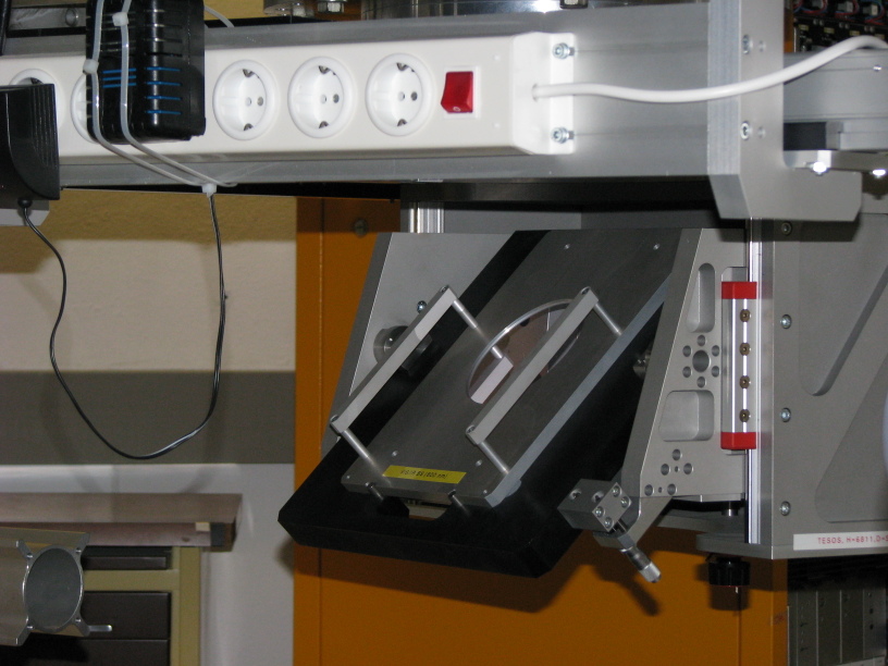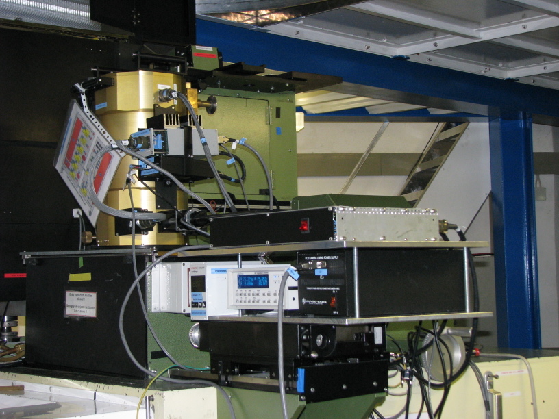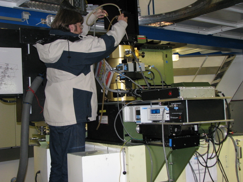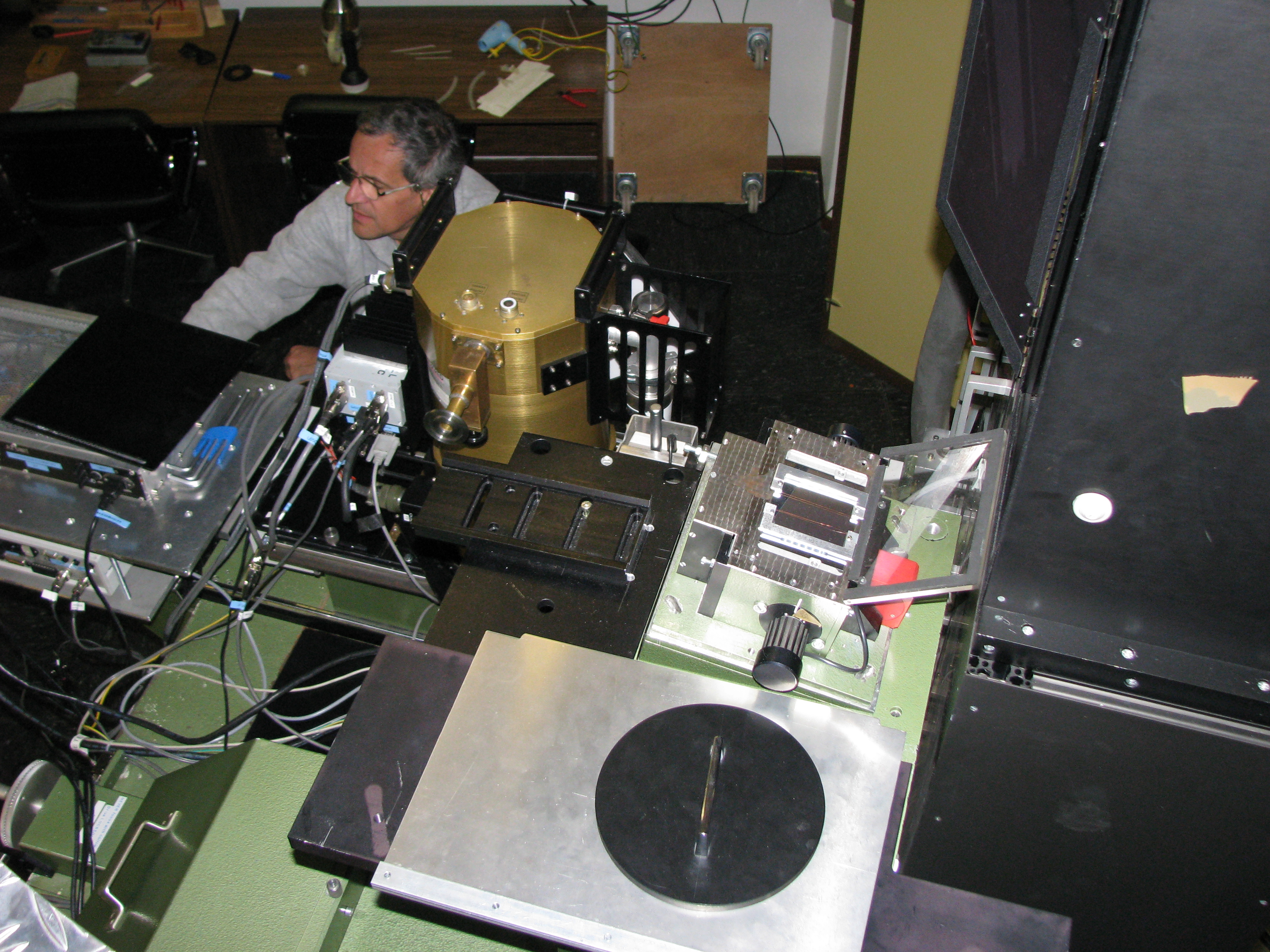 VTT: Cristian Beck checking the lyquid nitrogen cooling of the TIP detector (left); entracle slit of the VTT Echelle spectrograph with the TIP detector and Ales Kucera checking status of the detector cooling.