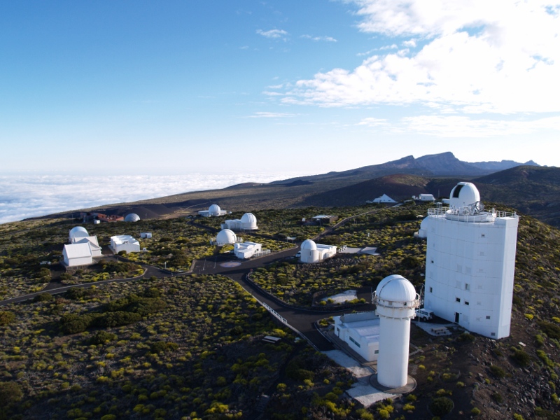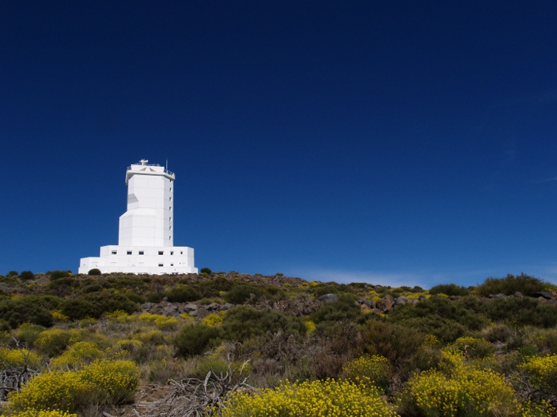 Observatorio Del Teide: gemeral view from the top of the VTT telescope (left); the VTT telescope alone with its 11 floors above the ground (right).