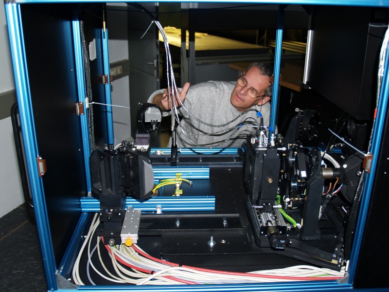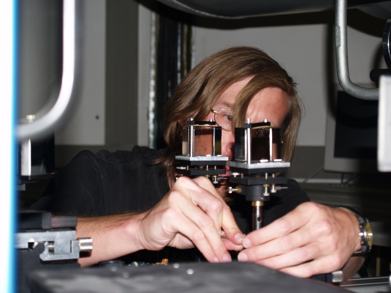 Christian Beck preparing the setup of the imaging system (left); Jan Rybak adjusting the setup of the imaging system (right).