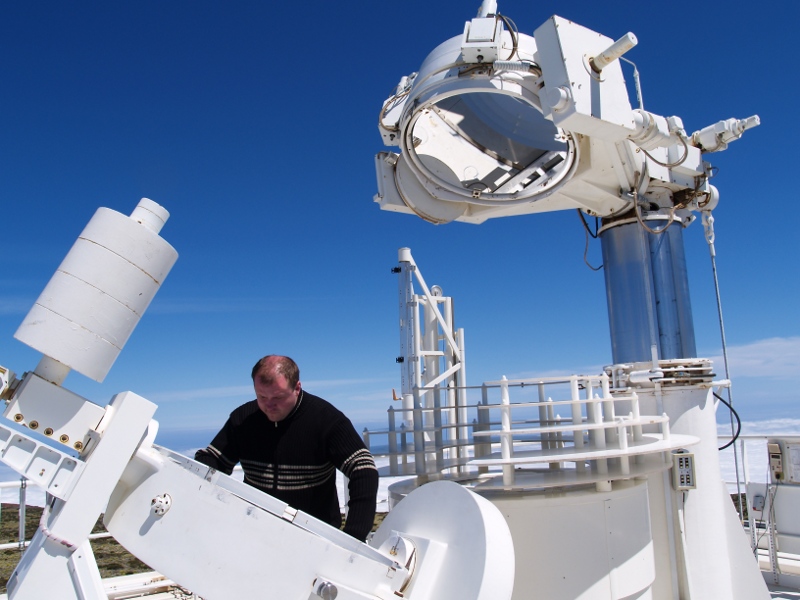 Peter Gomory covering the mirror of the VTT coelostat (left); Christian Beck, Peter Gomory and Jan Rybak in the optical labor of the VTT telescope (right).