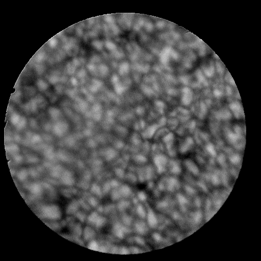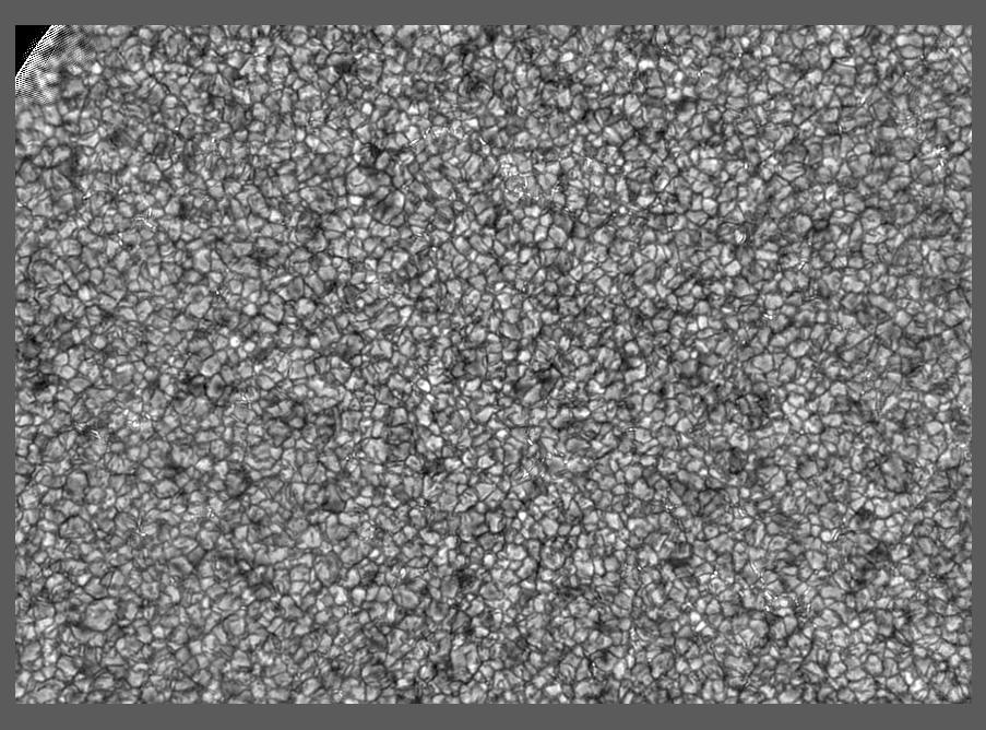 G-band image of the disk center which was taken on 24.4.2010. The images are speckled using the KISIP speckle code. Telescope: VTT, post-focal instrumentation: G-band 1nm filter, additional optics to devide and focus the beam in front of the TESOS spectrometer, PCO 4000 camera.